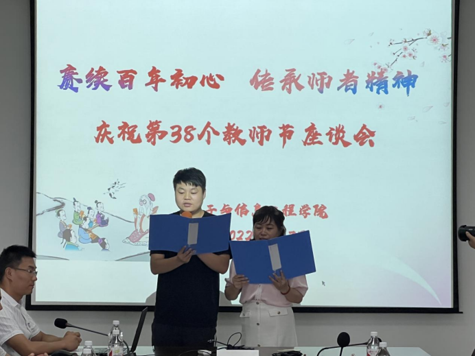 祝福视频结束后,电信学院教师代表成英丽、丁敏喆为大家献上一首《感念师恩》诗朗诵,以表达对全体教师的祝福。