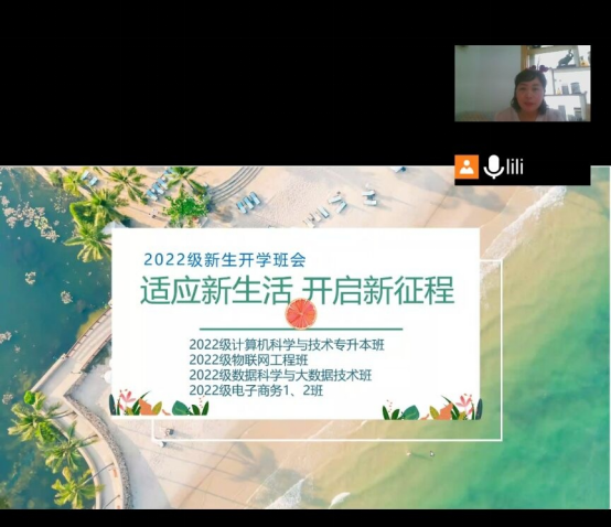 2022年9月10日上午,电信学院2022级新生班级在线上召开了以“奋斗新征程 筑梦新启航”为主题的入学班会,班会由辅导员成英丽老师主持,2022级计算机科学与技术、物联网工程、数据科学与大数据技术、电子商务专业全体同学参加。