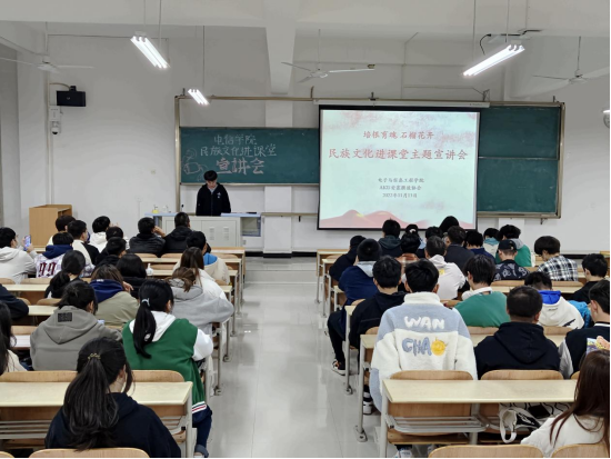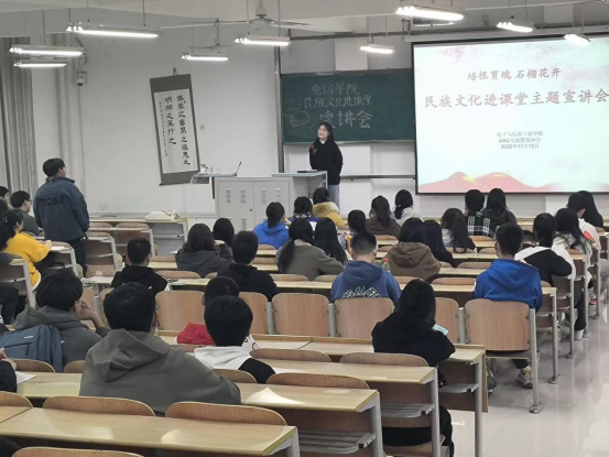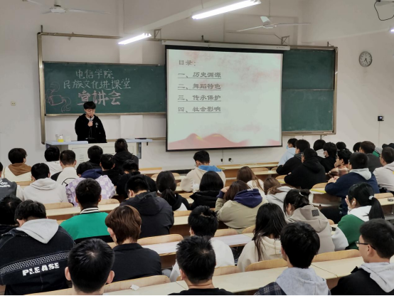 古以文载道,今以文聚力。为积极传播与弘扬中华优秀传统文化,加强非物质文化遗产知识普及,弘扬中华民族精神、传播民族团结主旋律,进一步凸显中华优秀传统文化铸魂育人功能,11月13日,电信学院开展以“培根育魂 石榴花开”为主题的民族文化进课堂宣讲活动。本次活动由电信学院腰鼓社负责人段银主讲。
