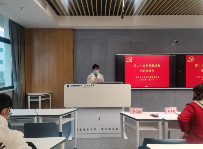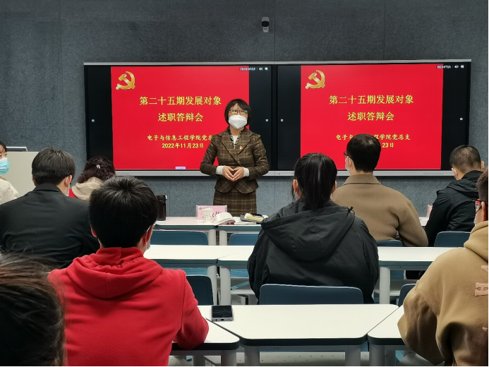 为进一步深入学习领会贯彻党的二十大精神,统一思想,切实增强党支部的组织力、凝聚力和战斗力,提升党员发展质量,结合支部党员发展工作需要,11月23日下午,电信学院学生第一、第二党支部在江北校区乡村振兴学院研讨室开展了2022年下半年发展对象述职答辩会,电信学院党总支书记于咏梅,党总支组织委员成英丽,学生第一党支部书记吕以宁(线上参与)、组织(纪检)委员张宇航,学生第二党支部书记李章雨、组织(纪检)委员石纭昊以及20名第25期发展对象参加答辩会。会议由学生第二党支部书记李章雨主持。