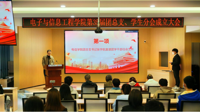 会议第二阶段,首先由张宇航领学党的二十大精神。他从全面领会党的二十大精神的主题及主要成果、深刻认识新时代中国十年的伟大变革及其里程碑意义,牢牢把握新时代新征程中国共产党的使命任务,用新的伟大奋斗创造新的伟业等方面,对党的二十大精神进行了系统解读。他表示,作为团学干部,要进一步深入把握党的二十大精神要义,切实把党的最新理论贯彻落实到日常学习、工作、生活中去,努力把自己培养成为一名能担当民族复兴重任的时代新人。他要求,电信学院团学干部要把党的二十大精神与自身实际相结合,奋力开创学习工作新局面,以更加饱满的精神书写新时代的青春答卷。最后,张宇航宣读了学生组织干部任命文件并对新一届学生干部表示衷心的祝贺。