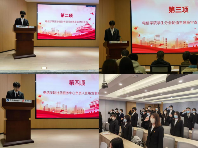 会上,团、学组织成员主要干部分别发表就职宣言。电信学院团总支副书记任金笑表示:“在新的学年中将加强团组织日常管理工作,制定各个部门相关工作建设,对各部门成员严格要求。协助团总支书记完成各项团务工作,做好校团委、学院党总支、团总支所交办的各项任务,定期召开例会,听取同学们的意见。”电信学院学生分会轮值主席薛宇森表示:“希望新一届的学生会成员要明确肩负的重任,努力增强自身责任感和使命感,充分调动主观能动性。积极主动地开展工作,把广大同学紧紧团结在一起,调动一切积极因素,促进学院的学生工作上一个新的台阶。”电信学院社团服务中心负责人张炬表示:“工作上,将做好社团服务中心自身的建设,以内部团队外树形象来要求自己以及部门成员;社团上,将积极配合社团开展活动,加强社团中心与各社团的联系;科普竞赛上,将积极与各级组委会及老师联系,为参赛同学构建一个良好的竞赛平台。”
