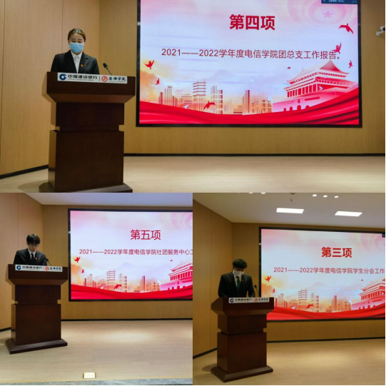 伴随着庄严的国歌声,会议正式开始。本次会议分为两个阶段,第一阶段为2021——2022学年度电信学院团总支、学生会、社团服务中心负责人做工作总结。他们立足本职工作,坚持问题导向,不断加强与学院领导、老师及其他同学的沟通,持续推进学院各项工作的高效开展。全体团学组织成员干在实处、走在前列,为努力打造“清新阳光”的学院氛围竭尽全力。