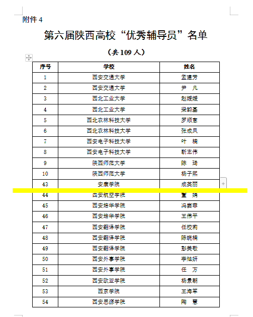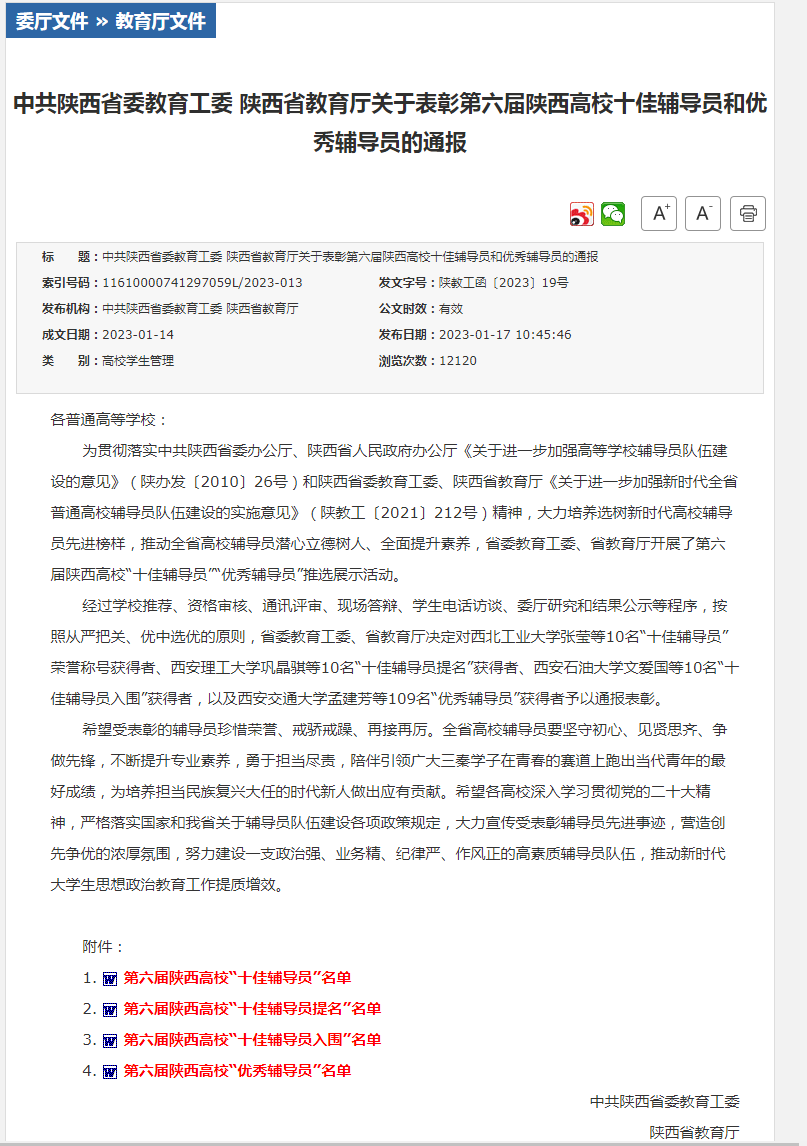 近日,中共陕西省委教育工委、陕西省教育厅发布《关于表彰第六届陕西高校十佳辅导员和优秀辅导员的通报》,欧美日韩国产在线辅导员成英丽获评陕西高校“优秀辅导员”荣誉称号。