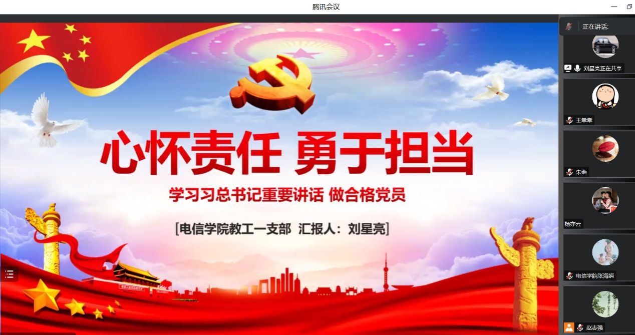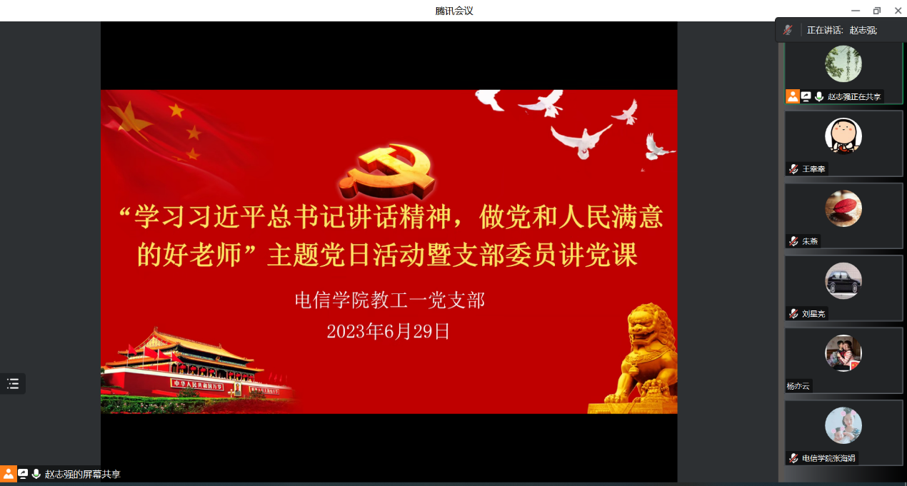 2023年6月29日19:30,电信学院教工第一党支部通过腾讯会议开展“学习习近平总书记讲话精神,做党和人民满意的好老师”主题党日活动暨支部委员讲党课。活动由教工第一党支部书记赵志强主持,支部全体党员参加本次活动。