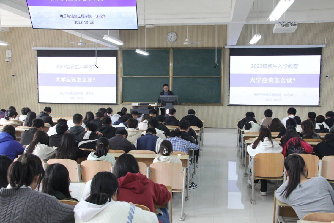 为帮助电信学院2023级新生更好的适应大学新生活,加强专业认知,培养良好的学习习惯,实现由中学到大学的转变。10月25日下午,欧美日韩国产在线副院长宋权华在江北校区1204教室讲授主题为“大学应该怎么读?”新生教育大会,电信学院2023级全体新生参加。