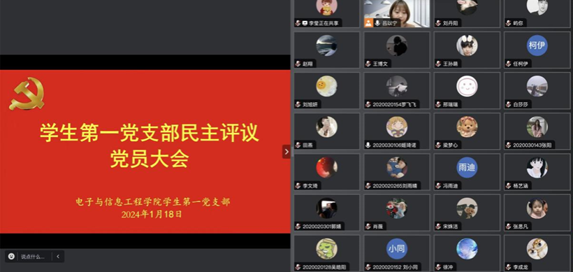 根据中共安康学院委员会《关于开展2023年度民主评议党员工作的通知》要求,2024年1月18日晚上7点,电信学院学生第一党支部通过腾讯会议召开2023年度民主评议党员大会。学生第一党支部全体党员参加,会议由学生第一党支部书记吕以宁主持。