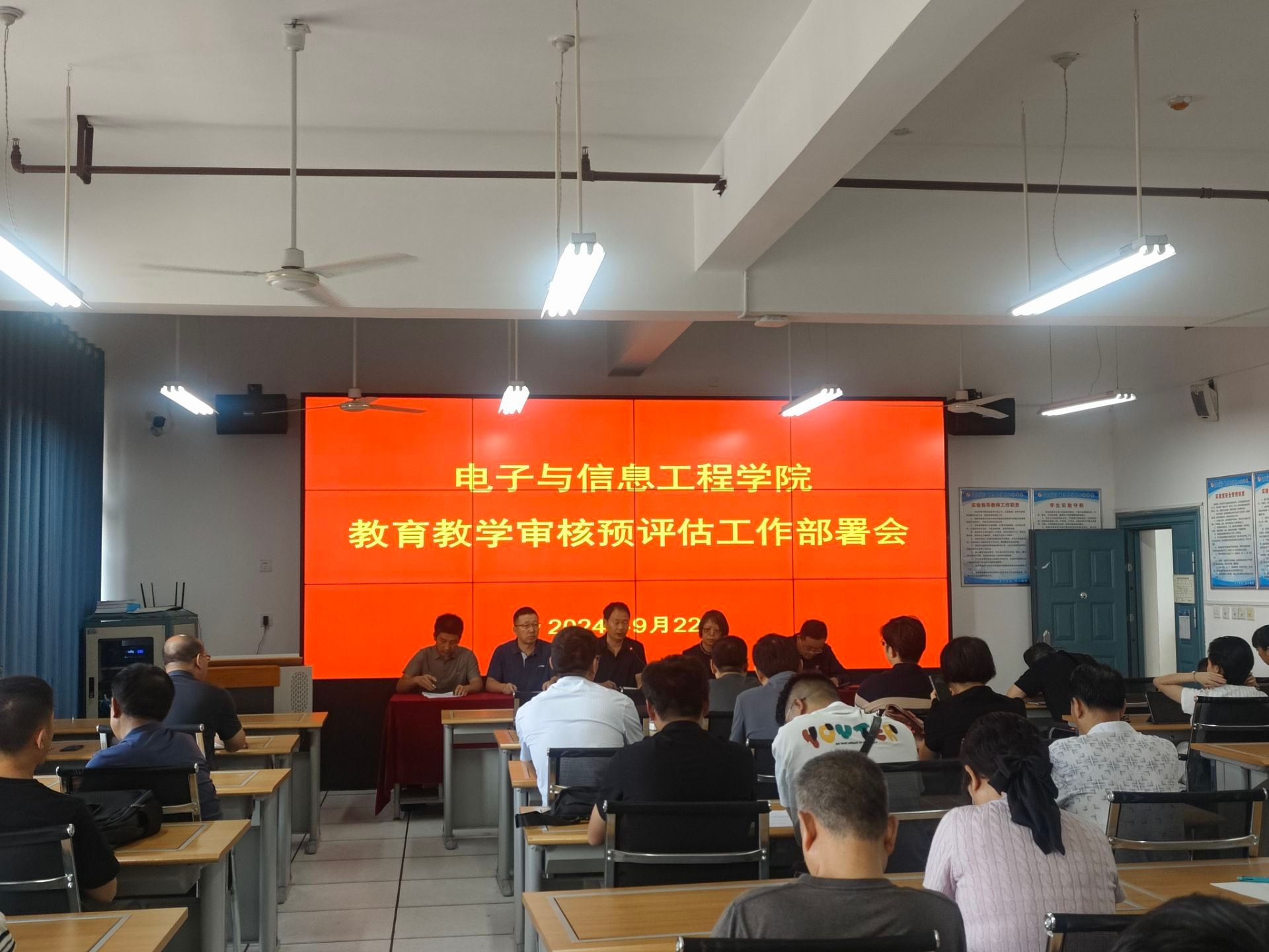 9月22日上午9:00电信学院在逸夫科技楼B602室召开迎接学校教育教学审核预评估工作部署会。会议由院长陈守满主持,电信学院全体教职工参加会议。