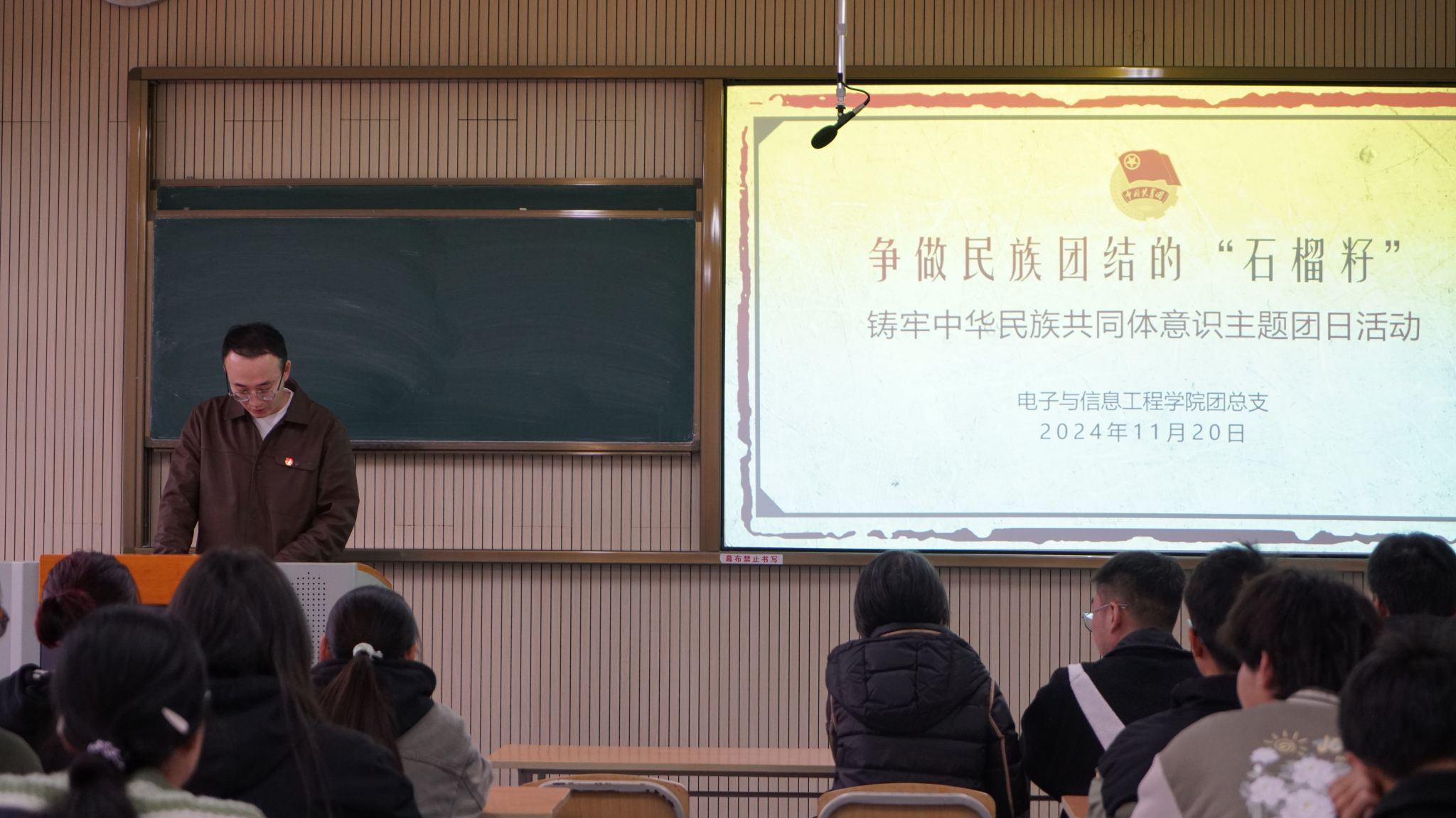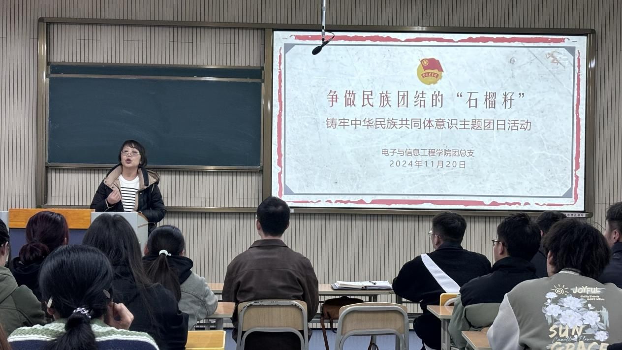 最后,于咏梅为参加活动的少数民族学生与团总支干部上了一堂生动的“微团课”。她讲到,铸牢中华民族共同体意识是实现中华民族伟大复兴的必然要求。实现中华民族伟大复兴的中国梦,是全国各族人民的伟大梦想、共同愿景。为进一步铸牢中华民族共同体意识,于咏梅对参加本次主题团日活动的全体团员青年提出三点希望和要求:一是讲好民族团结故事。基层团组织要发挥引领作用,通过主题团日活动,依托微视频制作宣传载体,把讲述红色故事与民族团结故事结合起来,以案例、视频、观影等感性认知方式,深入班级、宿舍,引导各族学生增强“五个认同”,铸牢中华民族共同体意识。二是弘扬、传承好民族团结精神。牢固树立“团结就是力量,团结才能胜利”的坚定信念,自觉成为有文化底蕴又讲文明修养的“橙”色青年。三是做汁水丰盈、红心向党的石榴籽。要认真学习科学文化知识,积极投身于民族团结进步的实践中,坚定不移听党话、跟党走,争做有理想、敢担当、能吃苦、肯奋斗的新时代好青年。