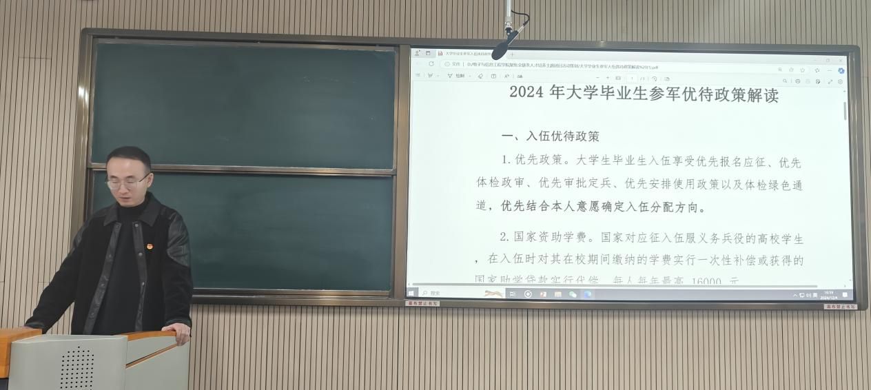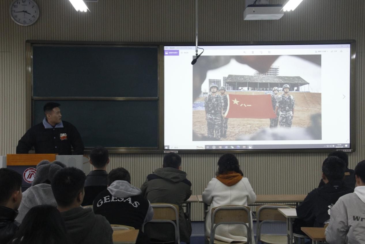 活动中,张宇航结合退役大学生士兵的个人经历,向参与活动的各年级学生干部进行了征兵政策宣讲,从部队的基本情况、参军入伍的意义、退伍后的安置三个方面,运用丰富的案例、深入浅出讲解了参军入伍的作用和意义,并从个人、家庭角度给大家算清了“三笔账”,即政治账、成才帐和经济账。他强调,兵员征集是国防建设的基础,是实现强军梦的基石,是我们每个人义不容辞的责任,是国家生存发展的客观需要,全体学生干部必须了解掌握政策,做一名征兵政策宣传员,用自己的实际行动为强军事业作出贡献。