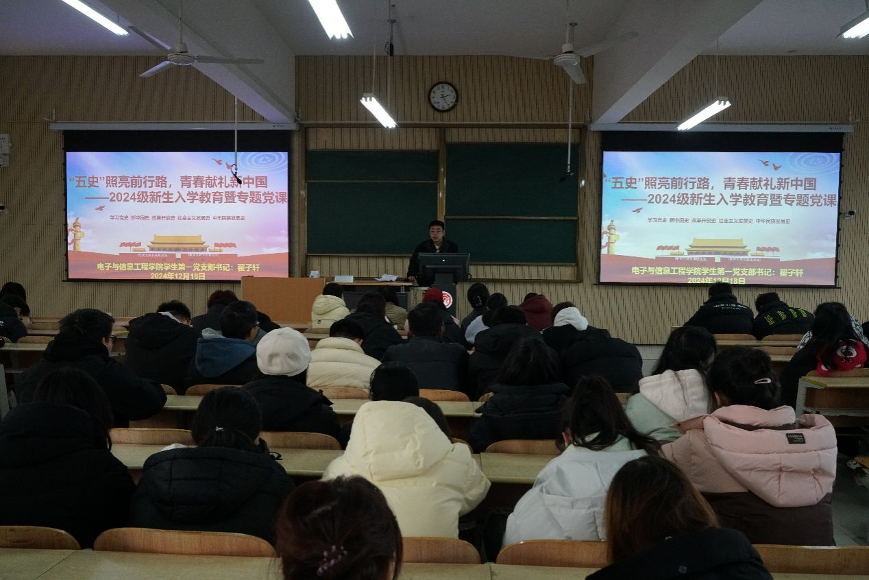 为深入学习党史、新中国史、改革开放史、社会主义发展史以及中华民族发展史,引导电信学子坚定理想信念,牢记初心使命,为实现中华民族伟大复兴的中国梦贡献力量。2024年12月18日,电信学院学生第一党支部书记翟子轩在江北校区1201、1203教室讲授主题为“五史”照亮前行路,青春献礼新中国的入学教育暨专题党课,电信学院2024级全体新生、学生党员参加。