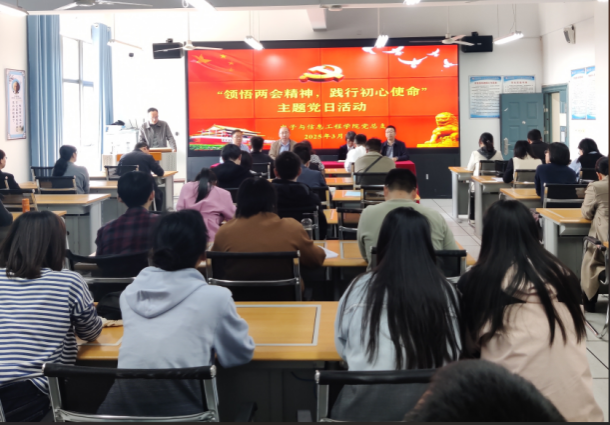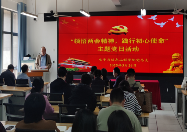 为深入贯彻落实全国两会精神,提升全体党员的政治素养和使命感,同时为扎实推进“五联五做”工作的开展,加强教工党支部与学生党支部的联系,3月26日下午,电信学院教工党支部和学生党支部在逸夫科技楼B602开展“领悟两会精神,践行初心使命”主题党日活动,本次活动由丁礼磊同志主持。